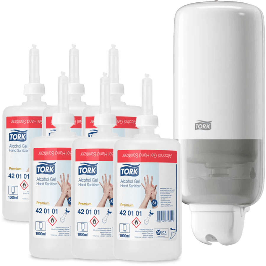 Kit Álcool em Gel: 1 Dispenser Sabonete Líquido Branco + Tork Álcool em Gel Antisséptico 6 frascos de 1 litro